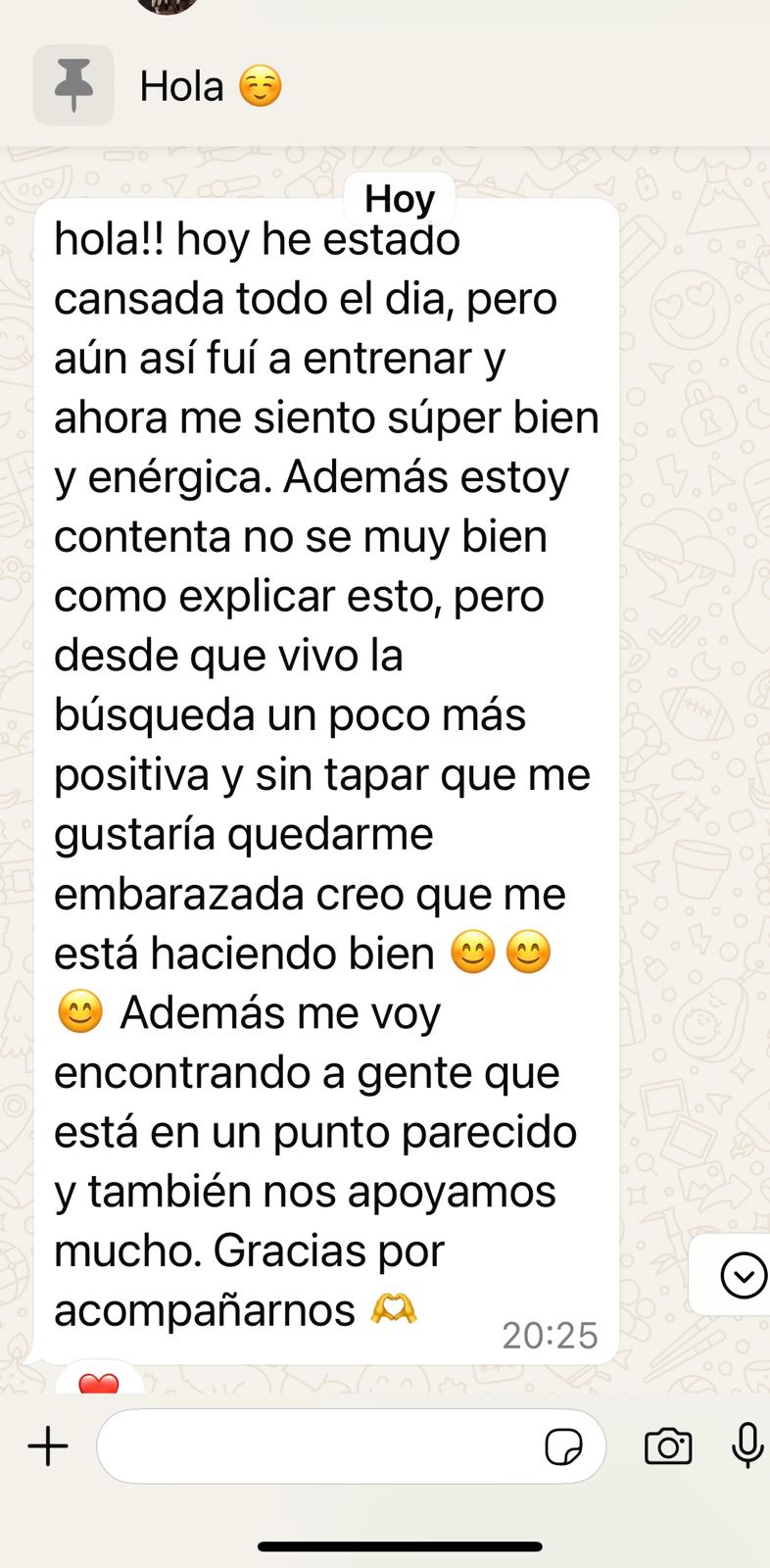 Confianza suficiente para contactar contigo y aprender que el proceso de búsqueda de un bebé comienza por aprender a conocerse a una misma, a saber priorizar y a entender que podemos mejorar todo lo que está de nuestra mano, como son los hábitos, el estrés, la alimentación, el saber decir que NO y aprender a poner límites pero también un proceso enriquecedor para controlar la frustración, los bloqueos que ni siquiera había permitido que saliesen a la luz y los miedos más profundos.
