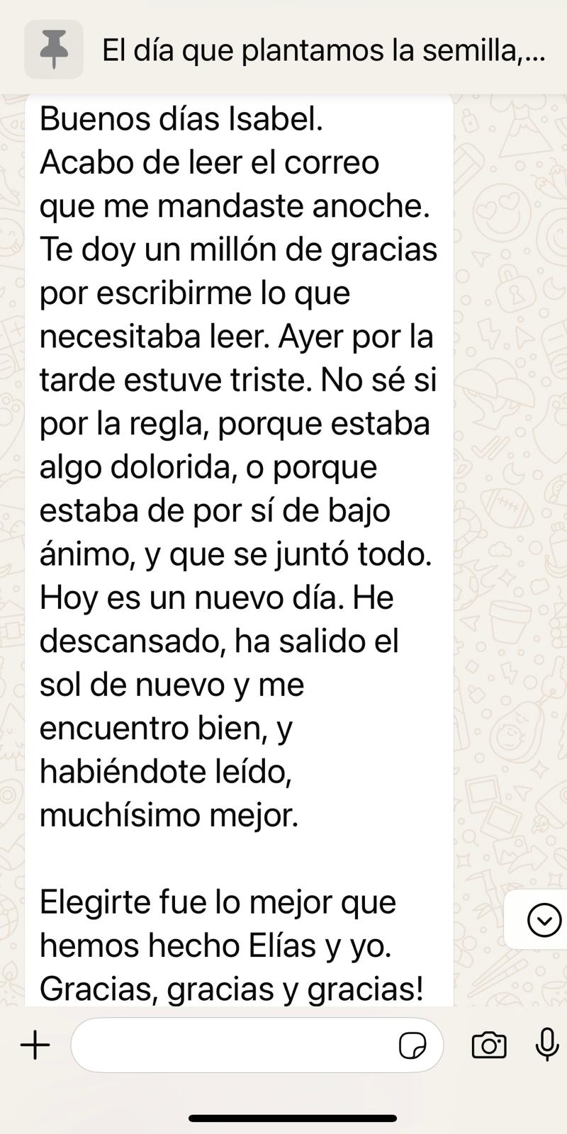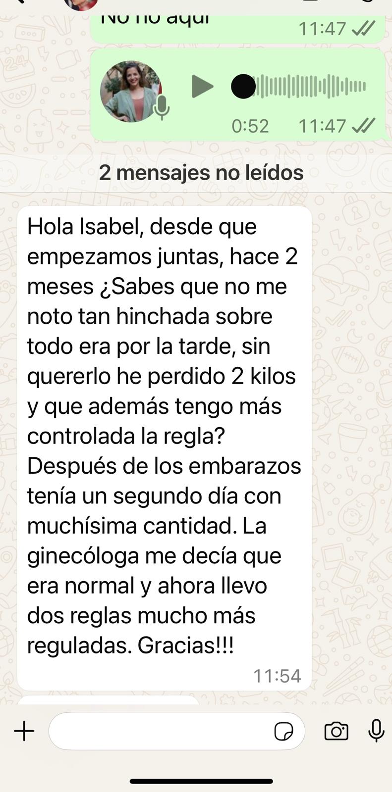 Fue casi al final del tratamiento, el cual lamentablemente no tuvo éxito, cuando comencé a tener sesiones con Isabel. Su intervención me enseñó la importancia de considerar todos los factores y lograr un equilibrio integral para alcanzar nuestros objetivos. Lo que más destacaría de la experiencia con Isabel es la sensación de ser tratados como casos únicos, con un enfoque individualizado y personalizado. Isabel analiza en profundidad tu vida y hábitos, explicando cómo estos influyen tanto física como emocionalmente. Su enfoque resalta la importancia de abordar todos los aspectos de manera equilibrada para alcanzar el éxito. Este equilibrio no solo te ayuda a mejorar físicamente, sino también a desarrollar hábitos más saludables. En el momento de escribir este testimonio, me quedan unas 5 semanas para ver la cara de mi hija, todo gracias a Isabel.